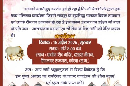 कोरबा (छत्तीसगढ़) गौ माता के प्रति श्रद्धा, सेवा और जन-जागरूकता को समर्पित एक भव्य भक्तिमय कार्यक्रम का आयोजन 16 अप्रैल 2026, गुरुवार को रात्रि 8:00 बजे प्राचीन शिव मंदिर, दशहरा मैदान, शिवनगर रुमगरा म...